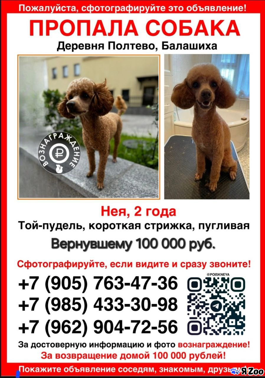 Описание 17.07.2024 в районе Полтево, Балашиха, был утерян той-пудель, девочка, 2 года, кличка Нэя.