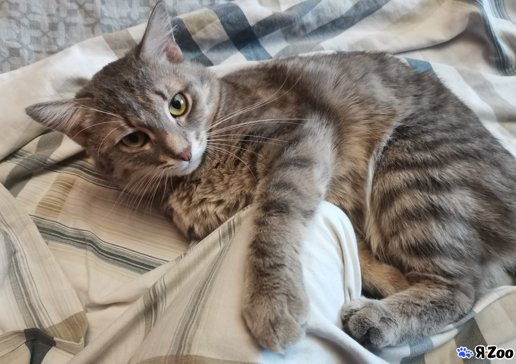 Для любителей полосатостей — кошка марфа, окрас ярко-полосатый, мордатенькая, на лапах крупные полоски, вес 2 кг, день рождения 15 марта 2025 г, здорова, привита, обработана