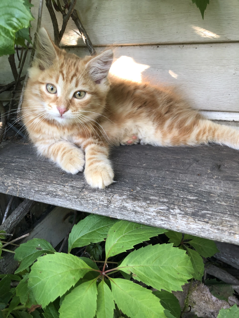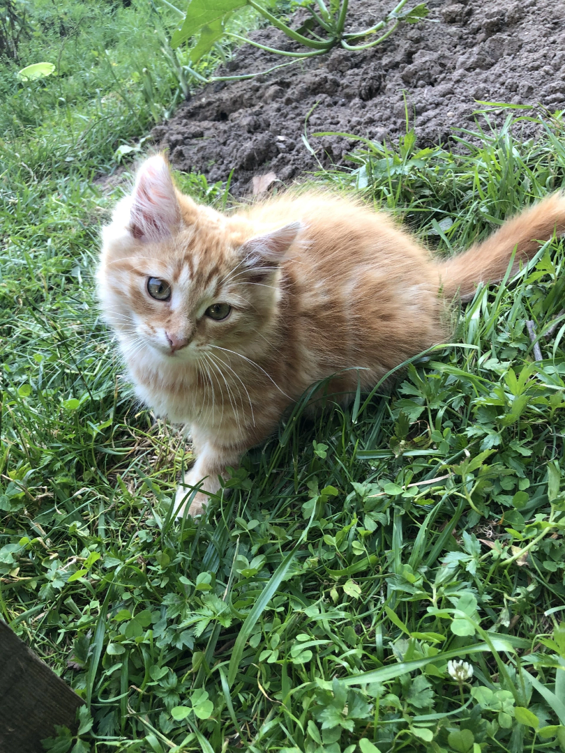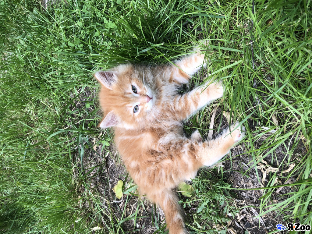 Кекс – рыжий пушистик, активный, любопытный, любит затаиться и выпрыгнуть за игрушкой, а еще когда его гладят по спинке. Станет большим, ласковым, в меру