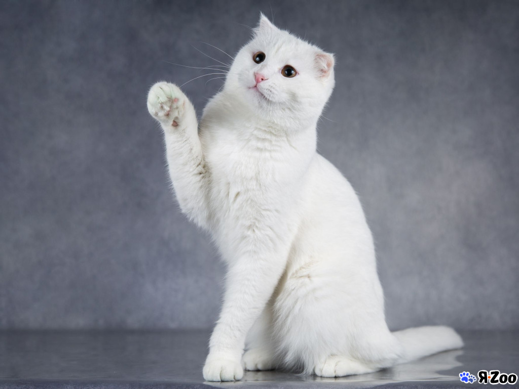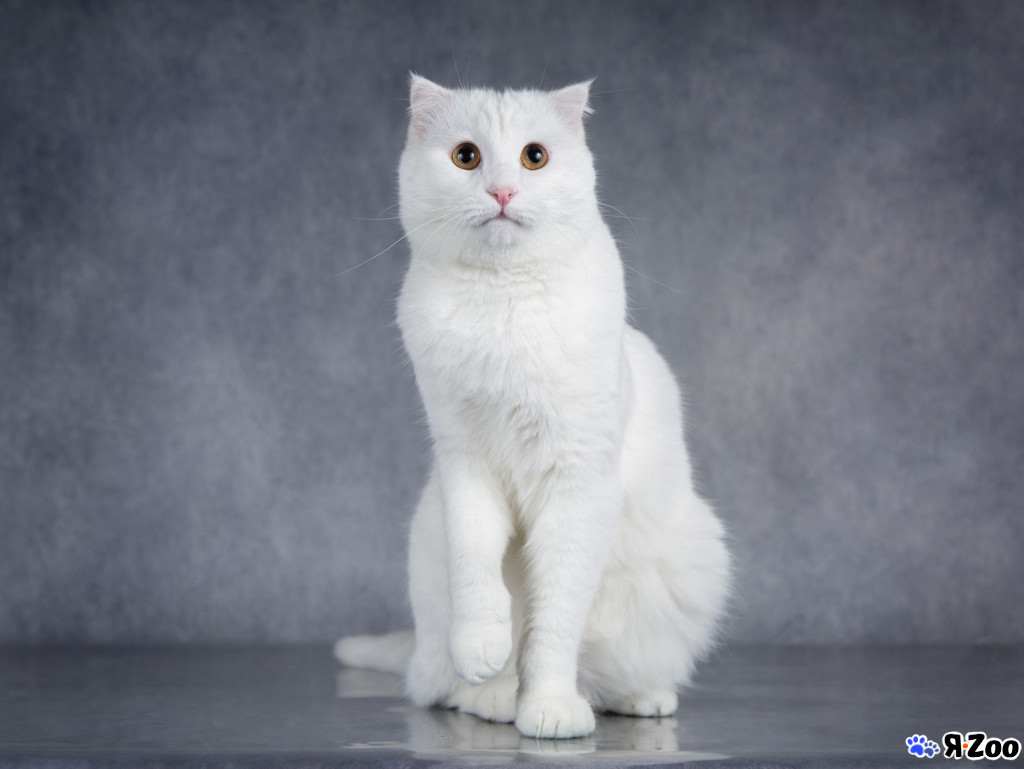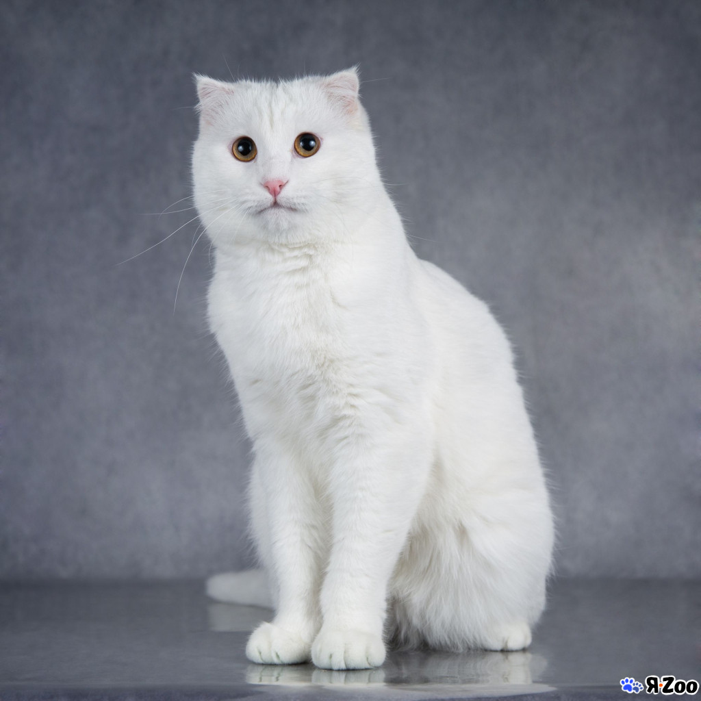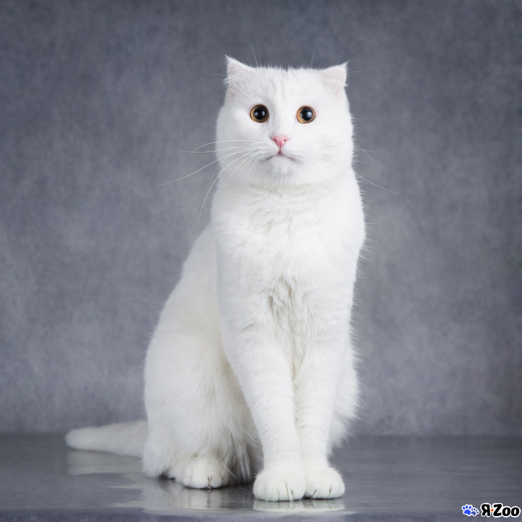 Порода: шотландский вислоухий белоснежный бархатный маугли – милый добряк, дружелюбный и забавный, он родился разноглазым, но в детстве лишился левого глазика, к счастью
