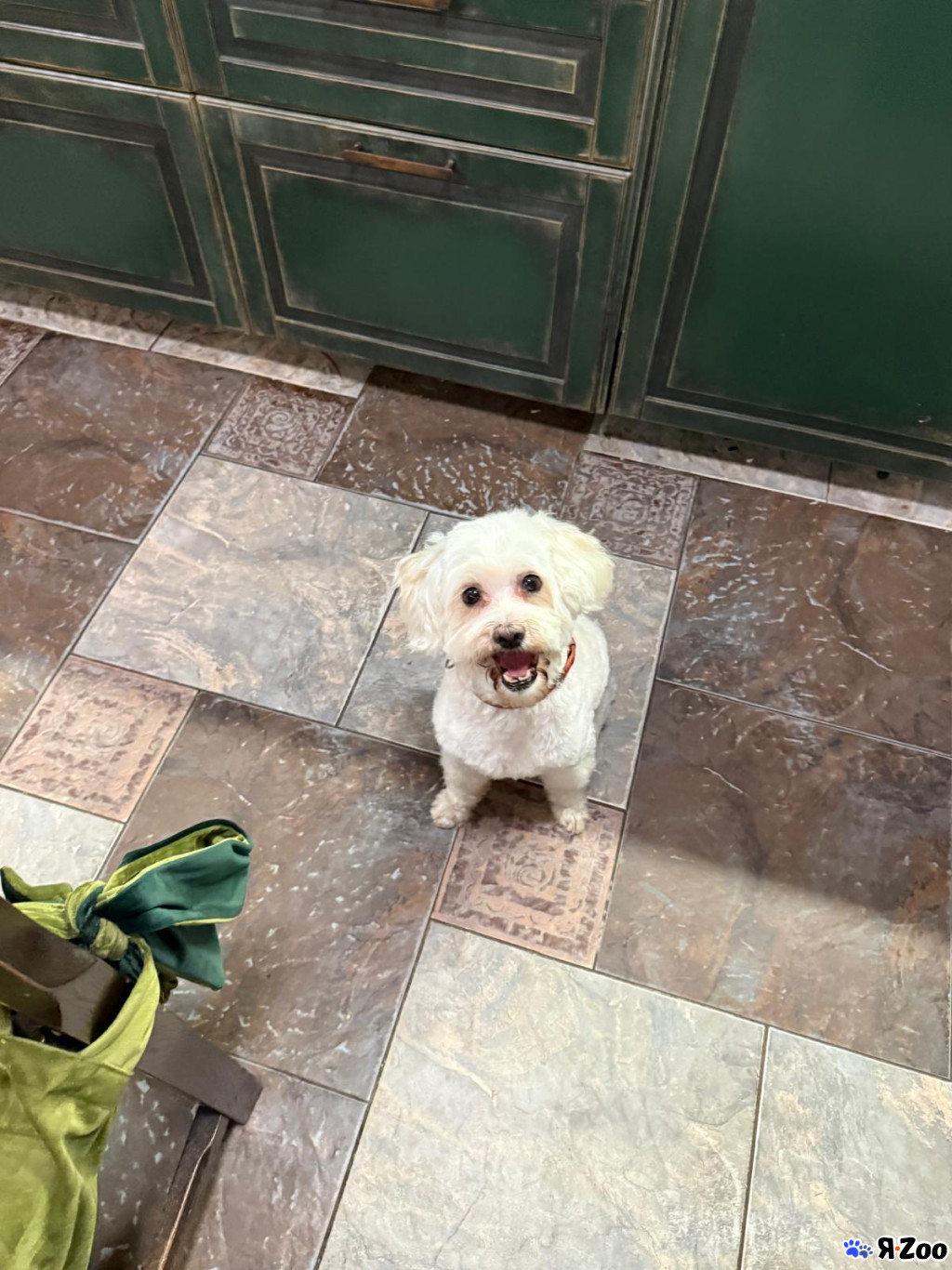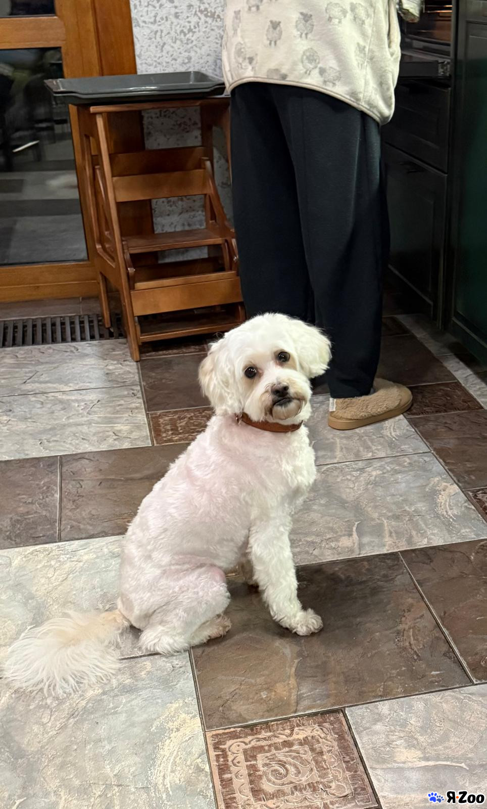 Бусе 8-9 лет, скорее всего, она помесь пуделя и бишон фризе. Рост в холке около 40 см. Шерсть у нее белая, практически не линяет.