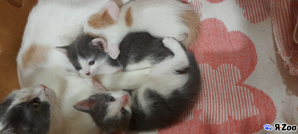 Красивые милые котята ждут своих хозяев, два котёнка серо-голубого цвета, один - бежево-полосатый, домашняя киска оказалась на улице и родила котят