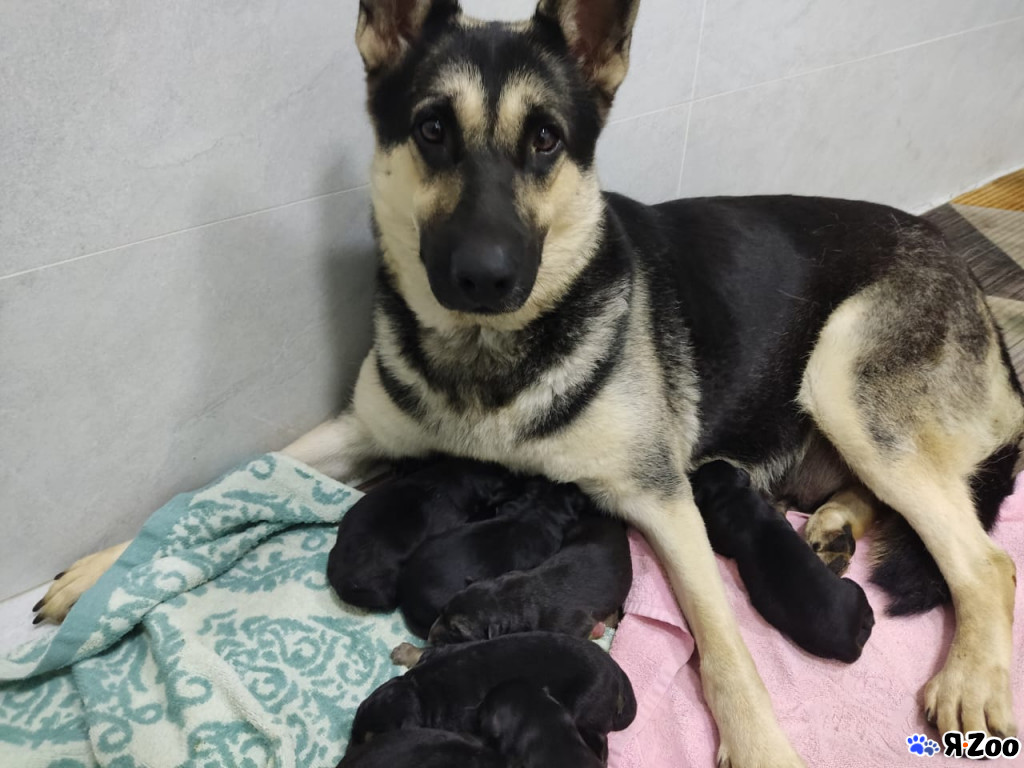 Мама – черно-белый чепрак, предки служат в МВД РК – обладает хорошим нюхом, интеллектом, безграничной смелостью и преданностью.